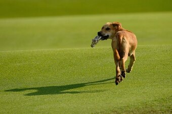 Event: A stray dog runs off with the day’s catch, having snagged it from a pond off a green during the King’s Cup golf tournament in Thailand.