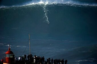 Event: A surfer is seen in the distance riding a behemoth of a wave off the coast of Nazare, Portugal, as bystanders look on.