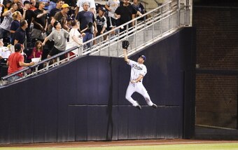 Event: San Diego Padres outfielder Seth Smith gives an A+ effort but doesn't come down with a foul ball hit by St. Louis Cardinals batter Matt Carpenter.