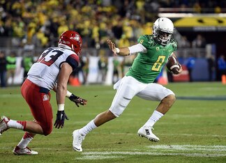 Event: University of Oregon quarterback Marcus Mariota strikes a perfect Heisman pose against a defender during the Pac-12 championship against Arizona. A week later, he won the award in one of the most decisive victories in history.
