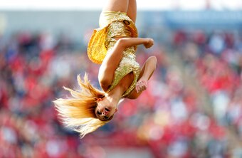 Event: An Edmonton Eskimos cheerleader is launched into the air during a game against the Calgary Stampeders.