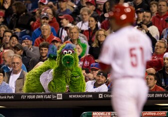 Event: The Phillie Phanatic casts a steely eyed gaze from atop the dugout on catcher Carlos Ruiz as he steps up to bat against the New York Mets at Citizens Bank Park.