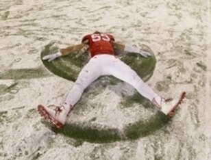 Event: Following a blowout win over Nebraska, Wisconsin linebacker Marcus Trotter celebrates by making snow angels on the field at Camp Randall Stadium.