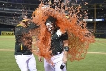 Event: Oakland A’s first baseman Stephen Vogt gets a pie in the face, followed up by a Gatorade shower courtesy of teammate Derek Norris, who hit the game-winning RBI single in the 10th inning against the Tampa Bay Rays.