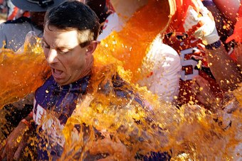 Event: Clemson head coach Dabo Swinney gets a Gatorade shower from his team after finally stopping in-state rival South Carolina’s series winning streak at five.