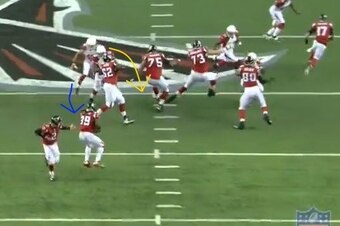 Foote was free to roam and lay some smack down with two blockers occupied by defensive tackle Tommy Kelly, making his decision to pursue from the backside a fine one. Tackles such as Kelly who vacuum up blockers are the foundation for any effective run defense.