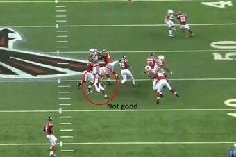 There were even numbers—four Falcons blockers and four Cardinals defenders—as Jackson looked to hit a developing hole on the right side. Foote faced a choice: fight through guard Jon Asamoah in an attempt to plug that hole while leaving a cut-back lane open, or sweep in from the backside and down Jackson before he reached the line of scrimmage.