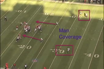He'll routinely blitz out of base and sub-package looks, while the coverage hardly ever deviates from some form of man coverage. Occasionally, it's 2 Man, underneath single coverage with the protection of a pair of safeties patrolling the deep zones.