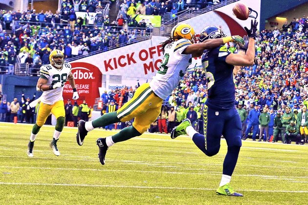 The first came via a beautifully floated 26-yard pass from Wilson to Marshawn Lynch that set up a one-yard Wilson touchdown run. The next occurred on the ensuing onside kick, when Packers tight end Brandon Bostick allowed an easy catch to bounce off his head and into the waiting arms of Seattle's Chris Matthews. And then another happened on the Seahawks' two-point conversion attempt after their go-ahead touchdown, when Wilson launched a floating prayer that came down in the arms of Luke Willson.