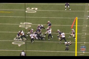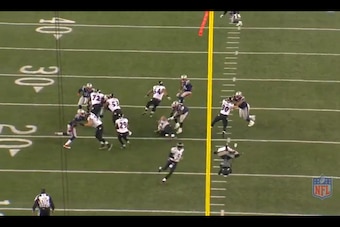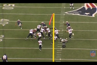 You'll notice that the edge defender was actually a defensive back (No. 20, Antoine Cason) in the screen shot above. The Patriots might want to consider having their box safety (probably Chung) act in a similar fashion when possible. Against the read-option this season, the Pats typically had the unblocked edge defender play contain and eliminate the quarterback keeper: