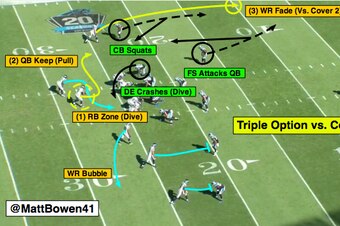 Another scheme that has shown up on the tape this season is the triple-option with Wilson once again reading the edge defender. However, in this situation, the Seahawks release the No. 1 wide receiver on the curl or fade depending on the coverage look in the secondary.