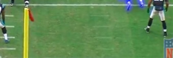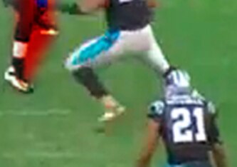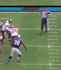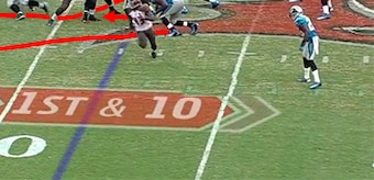 On this play, Hardy is lined up at left defensive end. The Panthers are in a 4-3 front with the strong-side linebacker lined up toward the other side of the defensive line. This allows Hardy to align on the outside shoulder of the right guard, across from the B-gap.