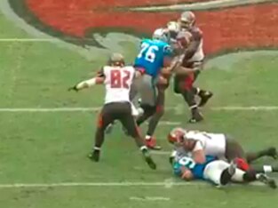 The Buccaneers are double-teaming the defensive end from the very beginning of the play. He is initially met by a tight end who is quick to get into a good position at the snap. Despite his good positioning, Hardy is able to swim past him with incredible ease and speed.
