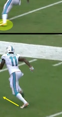 This time, Tannehill does throw the ball to Wallace, but the receiver is incapable of catching the ball as he falls over his own feet. Even though Wallace didn't make the play on the ball, he did create four yards of separation behind Revis with his route.