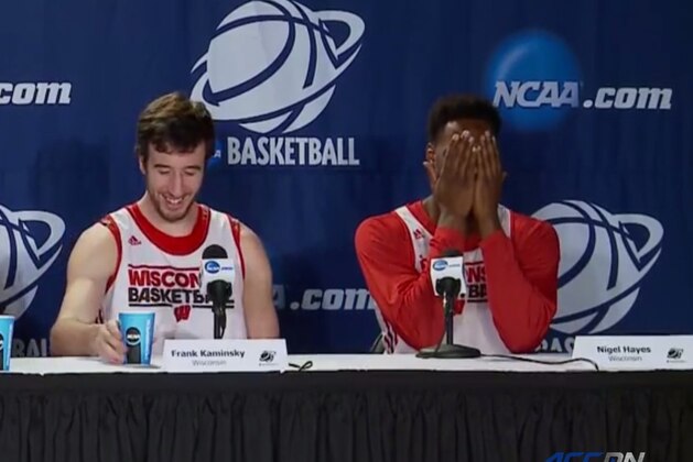 After answering a question at a press conference, Wisconsin Badgers sophomore Nigel Hayes whispered to his teammates, "Gosh, she's beautiful." Unfortunately for Hayes, the microphone picked it up, and he soon realized that everyone heard what he said.