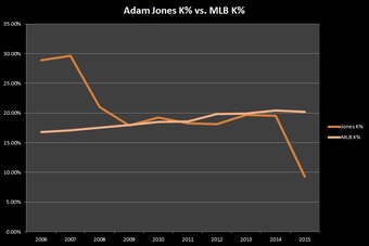 There's one area in particular where that's obvious. One of the knocks on Jones throughout his career has been that he doesn't make enough contact to justify his hyper-aggressive approach, as his strikeout rates have tended to be right around league average.