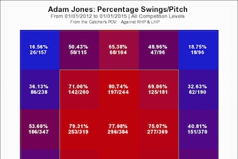 On the surface, it doesn't actually look like Jones is being more selective. Through Tuesday, FanGraphs had his overall swing rate at a very Jones-like 55.2 percent. At 41.3 percent, he's also chasing pitches outside the strike zone at a very Jones-like rate.