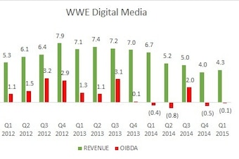 Meanwhile, the "Digital Media" segment only brought in $4.3 million in revenue. Previously, this segment included revenue from the WWE Magazine division (which was shuttered last year during cost-cutting measures) and webcasts of WWE PPVs (cannibalized by launching the WWE Network).