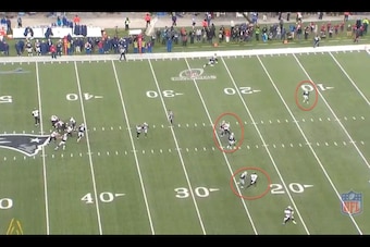 The Pats rolled out a modified version of this on their game-sealing pick against the Baltimore Ravens in the Divisional Round. New England actually has four safeties (partially because Browner got hurt in this game). McCourty dropped down to cover Kamar Aiken in the slot, while Tavon Wilson and Chung combined to double-team Joe Flacco's first read, Owen Daniels. That left Harmon as the roaming center fielder, and the young safety made the correct read to the sideline for the interception: