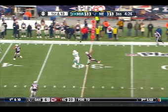 Here's the more conventional three-safety example against Miami. Harmon was once again the deep center fielder, as McCourty rolled down into the box at the snap. He and Browner appeared to have a "thumbs" coverage call, with McCourty taking the under and Browner the over zones. However, it's Chung's range that makes this play, as he rolled out with Ryan Tannehill and gained enough depth to deflect this pass for an incompletion: