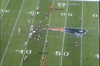 Both received safety help in the above screenshots and had relatively easy assignments, only needing to cover the deepest outside-breaking route. But McCourty and Dennard were both allowed to release into those reads in ways that best suit their skill sets, an example of a small tweak the Patriots can make to tailor their coverage to their misfit cornerback groupings.