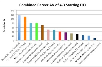 Belichick has had success with young interior duos before, as rookie Vince Wilfork and fourth-year pro Richard Seymour were huge assets on the 2004 championship-winning squad. Seymour was already a two-time All-Pro selection at that point, though, a far glitzier resume than either Easley or Brown can boast at the moment. It's not a stretch to suggest that New England has the least proven DT duo in the league—using the projected depth charts from Ourlads, here's a look at the combined career AV of the starting defensive tackles on 4-3 teams: