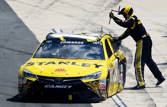 Edwards ran well on the track on Sunday at Dover, but two pit-road snafus really doomed him. First, his tire changer Matt Ver Meer was removing a wedge wrench when Edwards took off after an early pit stop, dragging Ver Meer with him a bit and causing Edwards to have to circle back around on pit road.
