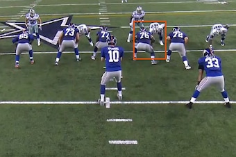 He shifted over to the right side of the Dallas line but maintained his 3-technique alignment. Hatcher positioned himself in the B-gap to isolate right guard Chris Snee: