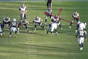 On this Liuget sack against the St. Louis Rams in Week 12, the Chargers spread their four linemen out. Liuget was again a 3-tech but would run a stunt with rush end Dwight Freeney.
