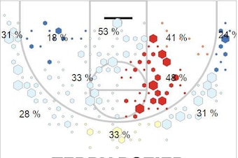As you can see from the Shot Analytics chart, Rozier shoots only 53 percent at the cup, which is hardly impressive. His saving grace is that he is a very good mid-range jump shooter from the right side of the floor.