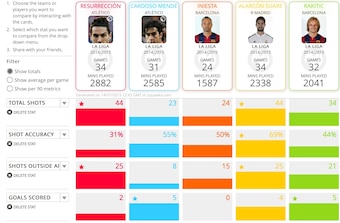 The image above, via Squawka, shows how Koke rattles off plenty of efforts in comparison to similarly offensive midfielders at top clubs in Spain (Tiago, Andres Iniesta, Isco and Ivan Rakitic) yet fails to trouble the more frequent scorers.