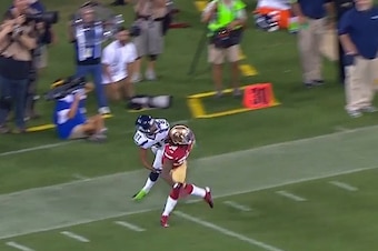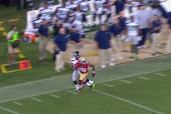 That's a feat of accuracy even the very best quarterbacks struggle with. Wilson's in that group, but he couldn't get it right here. His bomb to Tate floated out of bounds, with Goldson still giving the wideout no room to breathe: