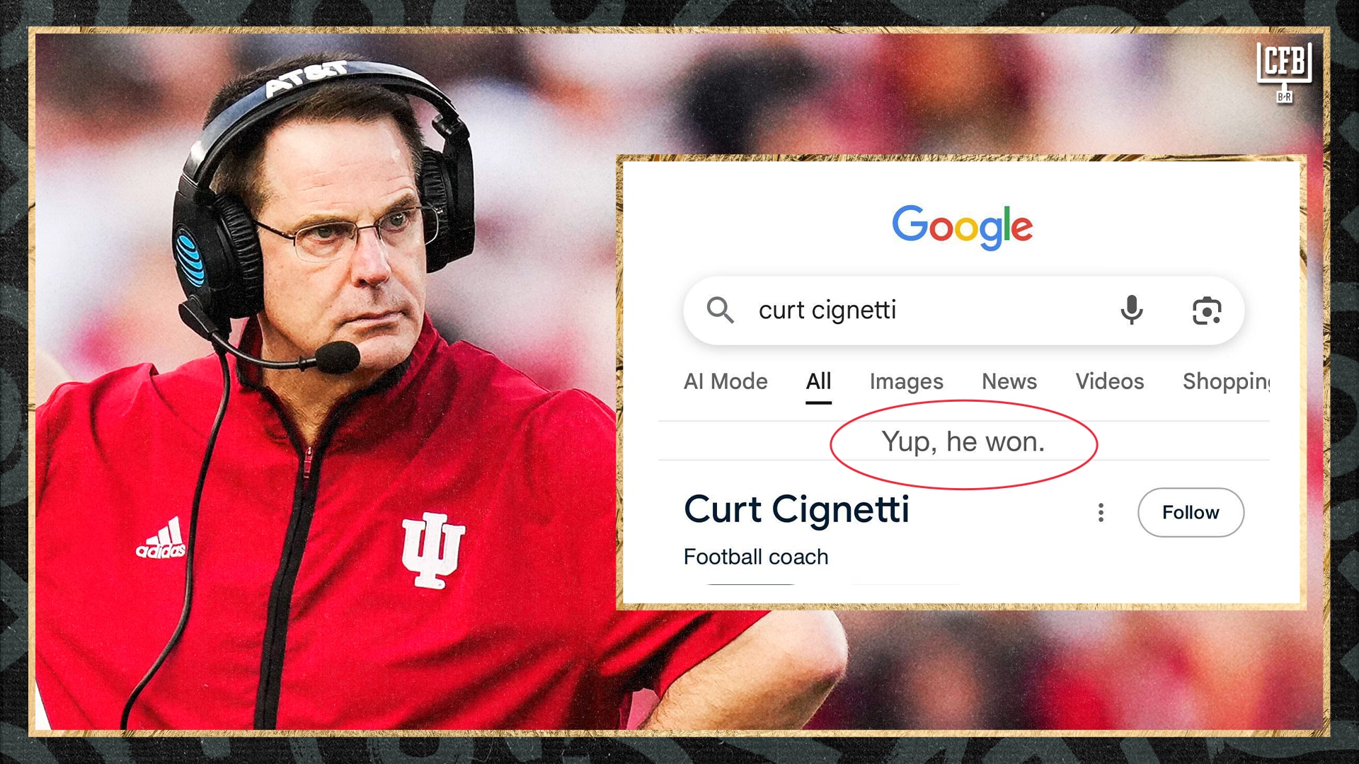 If fans google the Indiana head coach, they are greeted with a message that says "Yup, he won."