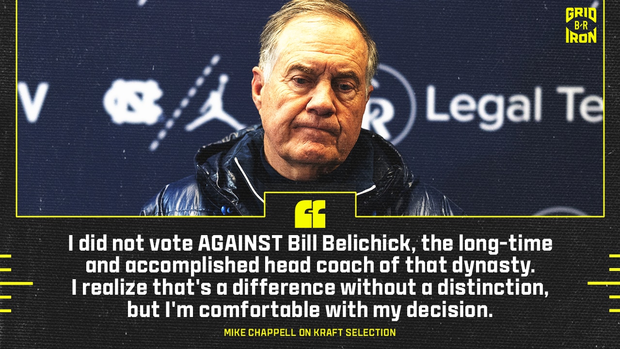But Chappell did vote for Kraft and pointed to his "role in building the Patriots dynasty beginning in 1994" before Belichick arrived while also noting "his undeniable role in helping negotiate the end of the 100-play-day work stoppage in 2011—while his wife was gravely ill—that has resulted in long-standing labor peace."
