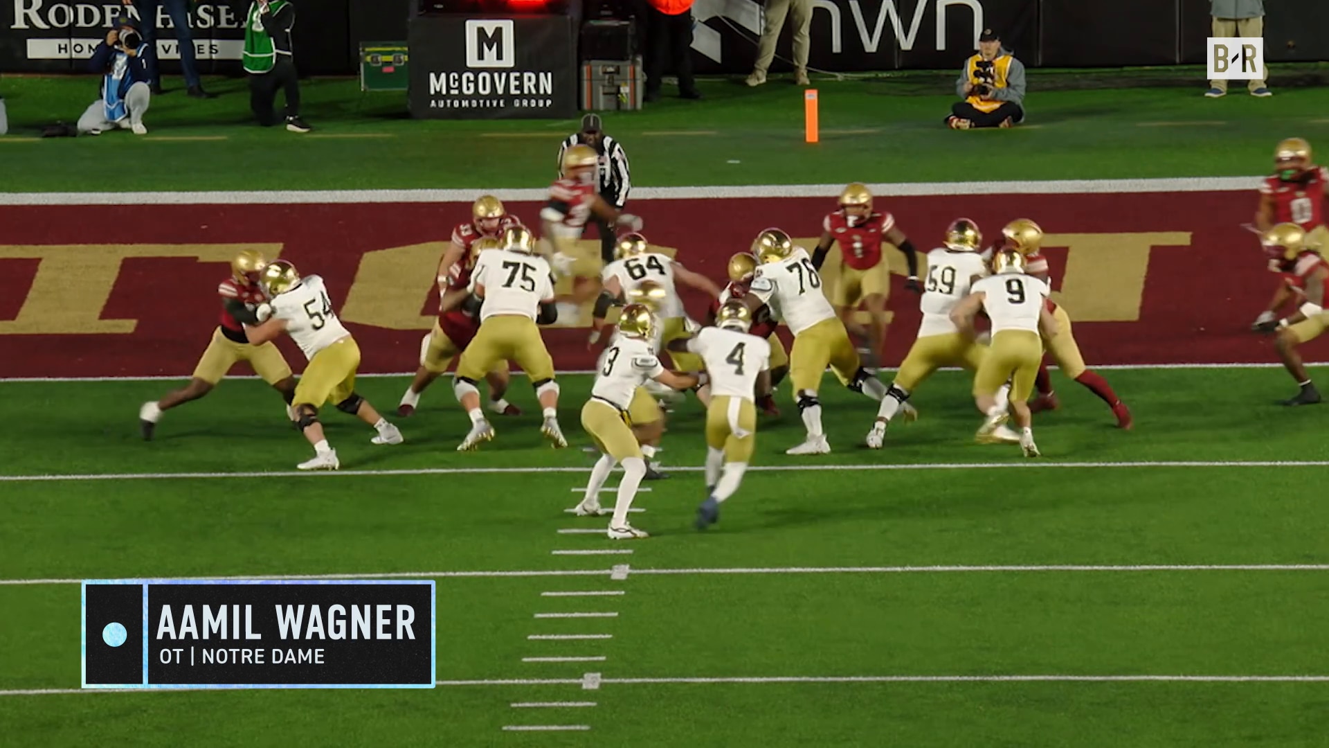 Aamil Wagner was a two-year starting right tackle and team captain at Notre Dame. His high-cut build and unrefined footwork are mitigated by his ability to cast a wide net with length and active hands that allow him to frame up, reset, stay attached and wall off defenders in both the run and pass game.