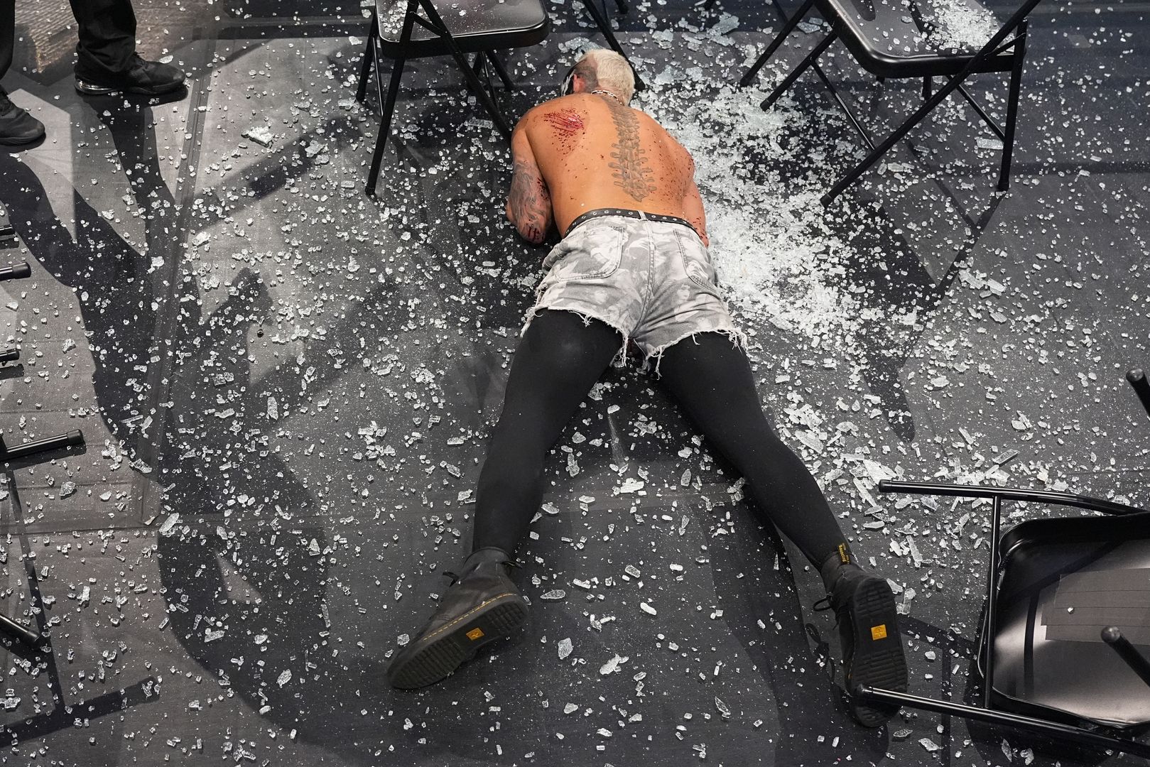 The Bucks moved, leaving Allin to crash through the glass below. Audible gasps and genuine concern for his well-being took precedence, with his back bleeding from the shattered glass and his stomach badly cut up.