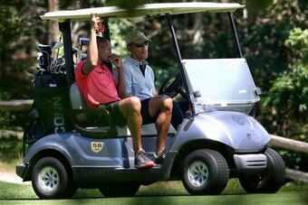 Joined by his mainstay fourth, Cyrus Walker, the foursome seemed to have a decent time on the course. The President and Allen shared a cart, which isn't notable except for, holy Lord, look at the calves on Ray Allen.