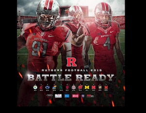 The "Battle Ready" slogan has been around in some form with Rutgers for a few seasons, and this tough, working-class approach to the program also exists in the form of scarred helmets they frequently wear. But the Scarlet Knights stepped it up in 2015 with the inclusion of a sword on their schedule poster.