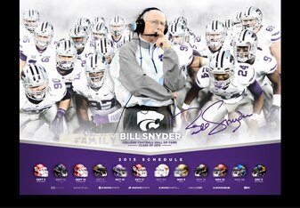 It's why K-State's stadium has his name on it and why he is the centerpiece of the team's schedule poster this year. Looking introspective as ever, with signature windbreaker and headset in place, Snyder is flanked by about 20 players who are all in Manhattan because of him.