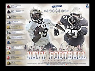 Navy's patriotism knows no bounds, and that's evident throughout its 2015 schedule poster. From the red-white-and-blue lettering on the bottom to the flag-bearing players in full gear to the stars and stripes in the background, the Midshipmen ooze 'Merica.