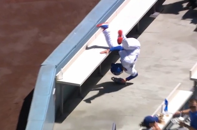Dodgers Ball Boy Tumbles Backward into Stands Trying to Catch Foul Ball