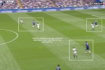 There were two key issues in this game. First, Swansea pressed superbly off the ball and Chelsea failed to. The first 30 minutes in particular were extremely impressive from the Swans, who were unwilling to give their opponents a moment's rest on the ball. Chelsea were constantly passing under pressure and often struggled to string together a run of five passes.