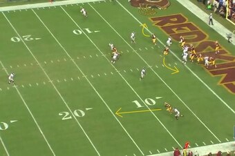 Or Cousins could choose to be ultra-aggressive. He had two receivers running vertically, and he was looking in the direction of Pierre Garcon to his left. Connecting with Garcon would result in an instant field-position shift, along with the possibility of quick points in a close game.