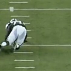With Ferguson scrambling for position, Beasley is able to attack his chest before the offensive tackle can repel him. Ferguson attempts to use his upper body strength to fend Beasley off before establishing a strong base with his feet.