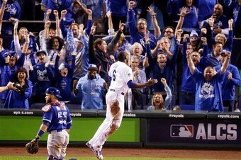 Wrong base. He should have thrown home, because over in the third-base coaching box, Mike Jirschele was waiting for this moment. Cain steamed around the bases like a locomotive, and as soon as Bautista made his move toward second, Jirschele never hesitated: He windmilled his arm and Cain never slowed. From first to home on a single, go-ahead run, pandemonium.