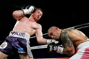Cotto wanted to land his powerful left hook to the body, but Canelo was hip to that strategy. He consistently turned his right side into Cotto's body when the two were in close quarters.