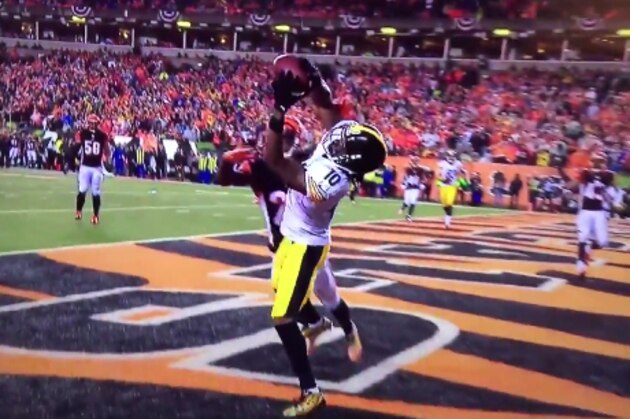 The Pittsburgh SteelersĀ receiver made an incredible touchdown catch on a 10-yard pass from quarterback Ben Roethlisberger in the third quarter of Saturday's AFC Wild Card Game at Paul Brown Stadium, extending the team's lead to 15-0 over the Cincinnati Bengals.