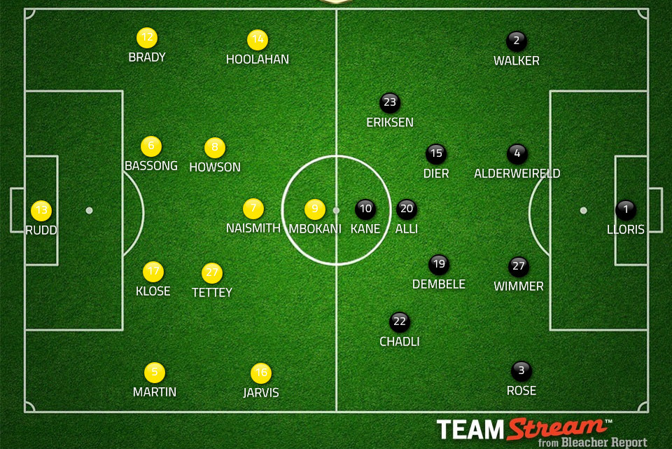 Without Vertonghen for the first league game this season, now may be the ideal time to catch the north Londoners out while new understandings between the rejigged groups are firmly established. Between the somewhat unpredictable hard-running of Naismith and Mbokani's strong hold-up work, the Canaries have players capable of doing so.