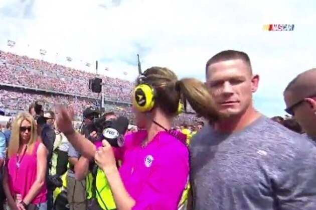 John Cena Gets Slapped in the Face by Reporter's Ponytail at Daytona 500