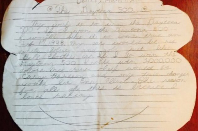 "My wish is to win the Daytona 500. If I won the Daytona 500, I would like it to come true on Feb. 17, 1998. My car would be red, white, blue and gold just like Bill Elliott’s. If I do win the Daytona 500, I could win 1,000,000 dollars. … The reason for all of this is because I love racing.